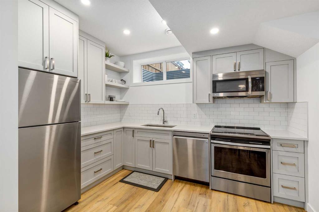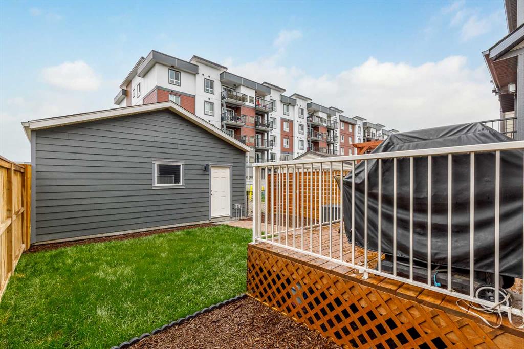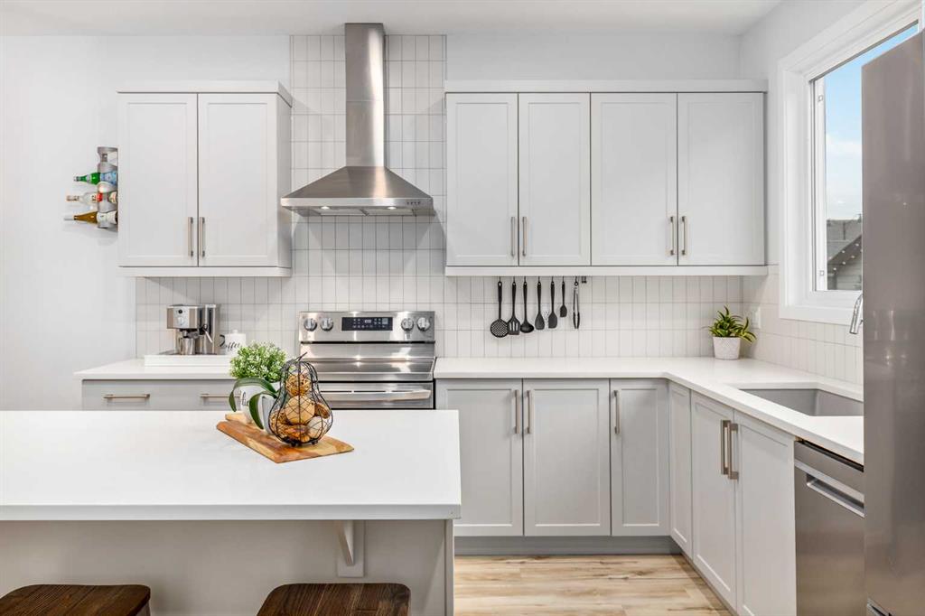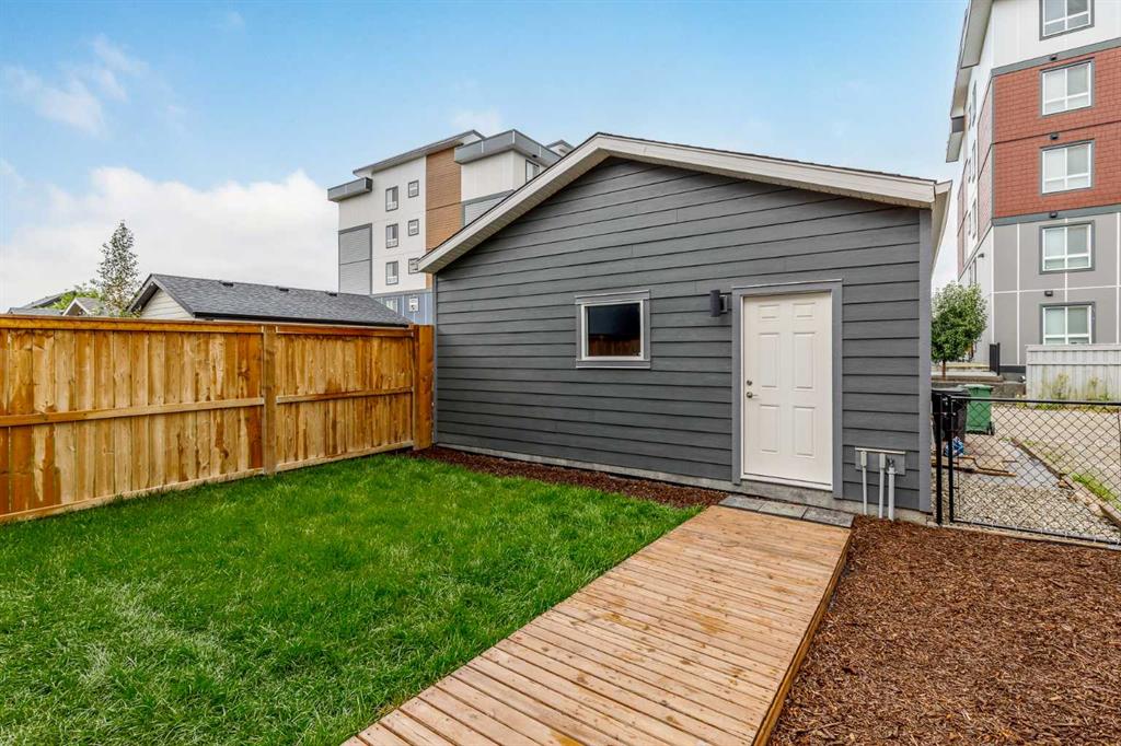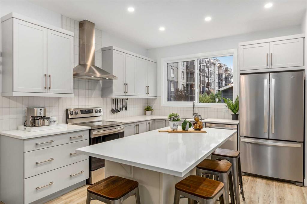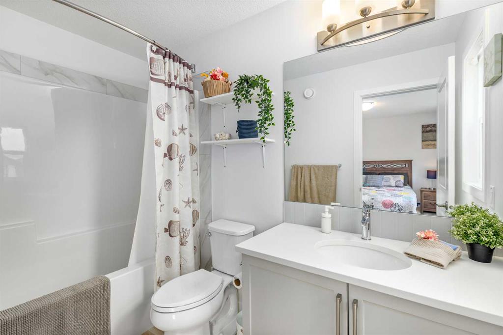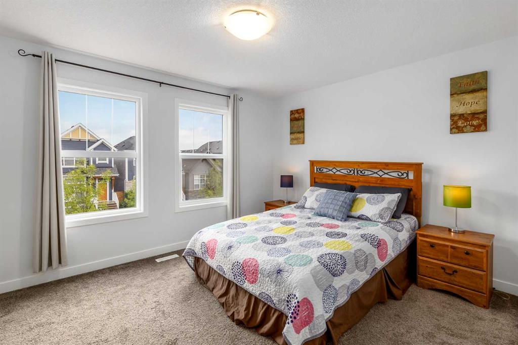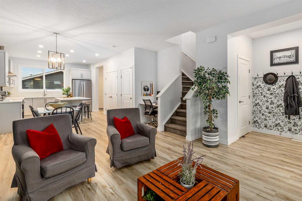 Welcome to this thoughtfully designed 2-storey home in the award-winning community of Mahogany, offering just over 1,450 sq ft of stylish living space above grade plus a fully developed legal basement suite. Built for comfort, versatility and modern living, this home blends timeless curb appeal with functional design inside and out. From the moment you arrive, you’ll be captivated by the home’s charming full-width front porch—a perfect extension of your living space where you can enjoy a morning coffee, watch the kids play, or simply soak in the vibrant energy of the neighbourhood. The open and airy layout immediately sets the tone for the rest of the home. Light oak-style luxury vinyl plank flooring runs throughout the main floor, complementing the neutral tones and giving the space a fresh, contemporary feel. At the front of the home, a spacious living room welcomes you with three large windows that flood the space with natural light. It’s the perfect gathering spot for relaxing evenings or hosting guests. Moving inward, the central dining area offers the ideal space for both casual weeknight meals and dinner parties, effortlessly connecting the living room and kitchen. The kitchen is a true showpiece, combining style and function with grey cabinetry, crisp white quartz countertops, a striking vertically stacked subway tile backsplash, stainless steel appliances, and a silgranite sink. The central island with seating creates a natural hub for conversation, while pot lighting keeps the space bright. A closet pantry across from the kitchen adds convenient storage. Off the kitchen, the rear entrance leads to your fully finished backyard complete with a deck—ideal for summer BBQs—and an oversized 22x24 double detached garage featuring EV charging capabilities and storage trusses above, giving you even more functionality. Upstairs, you’ll find two generously sized kids’ bedrooms at the back of the home, a full 4-piece bathroom, and a laundry closet tucked conveniently into the hallway. The primary suite at the front is bright and spacious, offering two large windows, a walk-in closet, and a private 4-piece ensuite for a true retreat experience. The legal basement suite, city approved was completed just 1.5 years ago, and adds incredible value. With its own separate entrance, this space offers a modern kitchenette featuring grey cabinetry, stainless steel appliances, quartz countertops, and subway tile backsplash. A cozy living area, one bedroom with a full-sized window and closet, a 4-piece bathroom, and a stand-alone washer/dryer make it completely self-contained. This home is also equipped with solar panels, offering energy efficiency and cost savings while reducing your carbon footprint. Enjoy lower utility bills & increased home value with this eco-friendly addition, designed to harness renewable energy & contribute to a more sustainable future. All of this, in Mahogany—the incredible 4-season lake community filled with amenities designed to enhance your lifestyle.