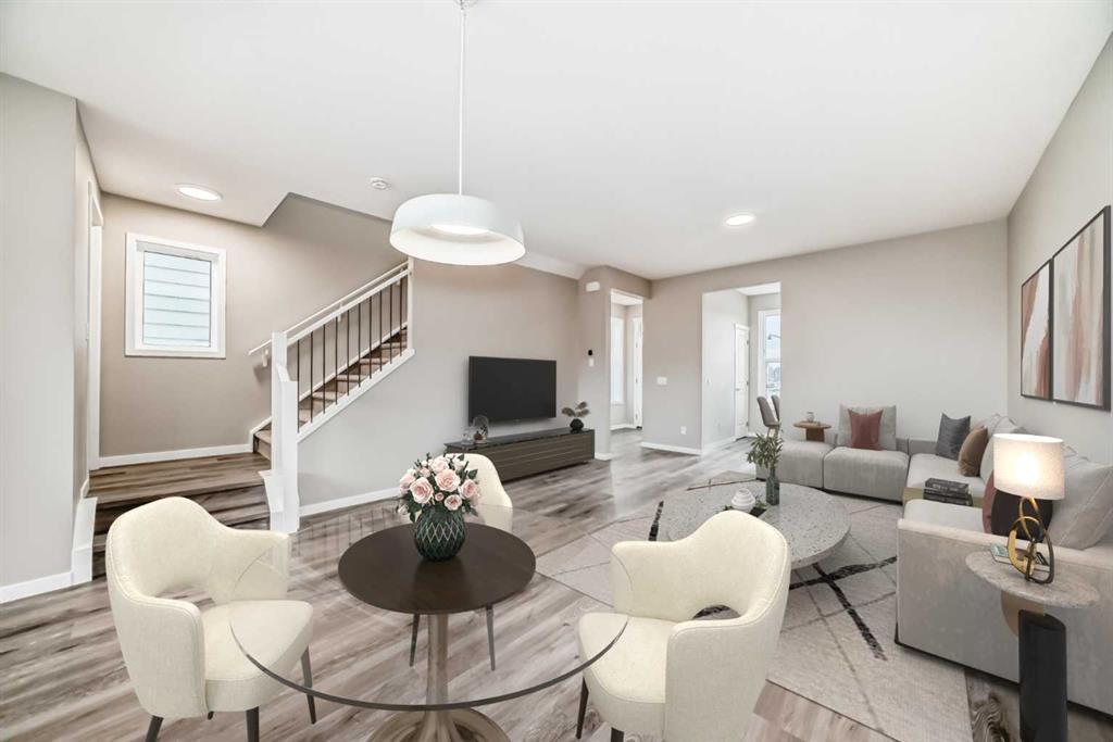 Meet the brand-new “Heath,” a fresh take on a beloved layout that blends smart design with everyday comfort. Step inside to a bright, open main floor finished in warm luxury vinyl plank, with a versatile front flex room that suits a home office, homework zone, or cozy reading spot. The rear of the home opens to an inviting living room and an oversized dining area—perfect for weeknight dinners and weekend gatherings alike. Anchoring the space, the chef’s kitchen showcases wood-grain cabinetry raised to the bulkhead, crisp white quartz counters, a classic subway tile backsplash that wraps the standalone hood fan, stainless steel appliances, and a large island that makes prep, snacks, and conversation effortless. A generous back window brings in natural light, and the practical rear entrance keeps daily comings and goings simple. Upstairs, a centrally located loft creates a true second living space and smart separation between the sleeping quarters. The spacious primary retreat features a walk-in closet and a spa-inspired 4-piece ensuite with dual sinks, while two additional bedrooms share a well-appointed 4-piece bath. The upper laundry room keeps chores convenient and out of sight. A side/secondary entrance adds flexibility for future possibilities such as a guest, in-law, or private living area (subject to city/municipal approvals and permitting). Outside, the landscaping is complete—front and back—so you can enjoy the space from day one. Expect finished sod, mulched side yards, and thoughtfully selected trees/shrubs in the front that complement the streetscape and elevate curb appeal. And the setting? You’re in Mahogany—Calgary’s four-season lake community—where life revolves around water, parks, and connection. Enjoy two residents-only beaches, the Beach Club, tennis and sport courts, winter skating, fishing, playgrounds, and more than 22 km of pathways and preserved wetlands. Stroll to the Village Market for cafés, restaurants, fitness, and daily essentials, with the South Health Campus and Seton Urban District just minutes away. From paddleboards to sunset walks, the Heath puts a resort-style lifestyle within easy reach.