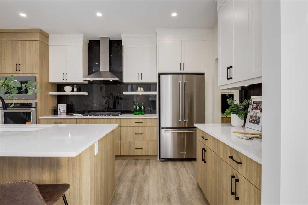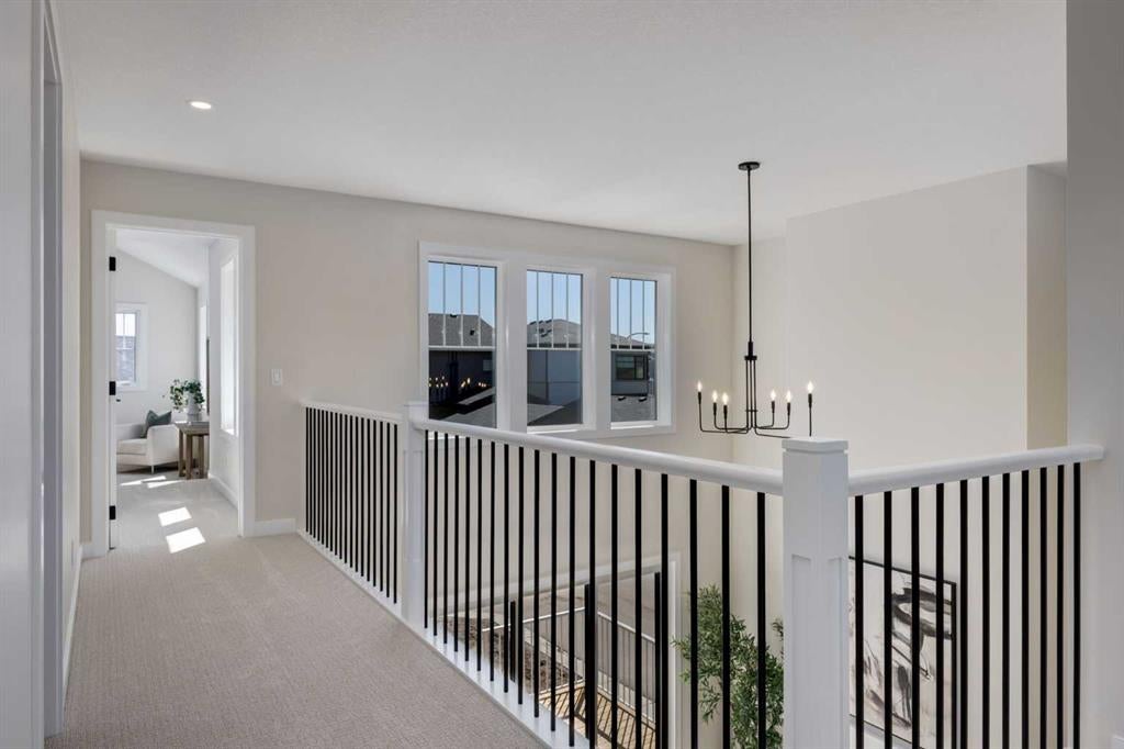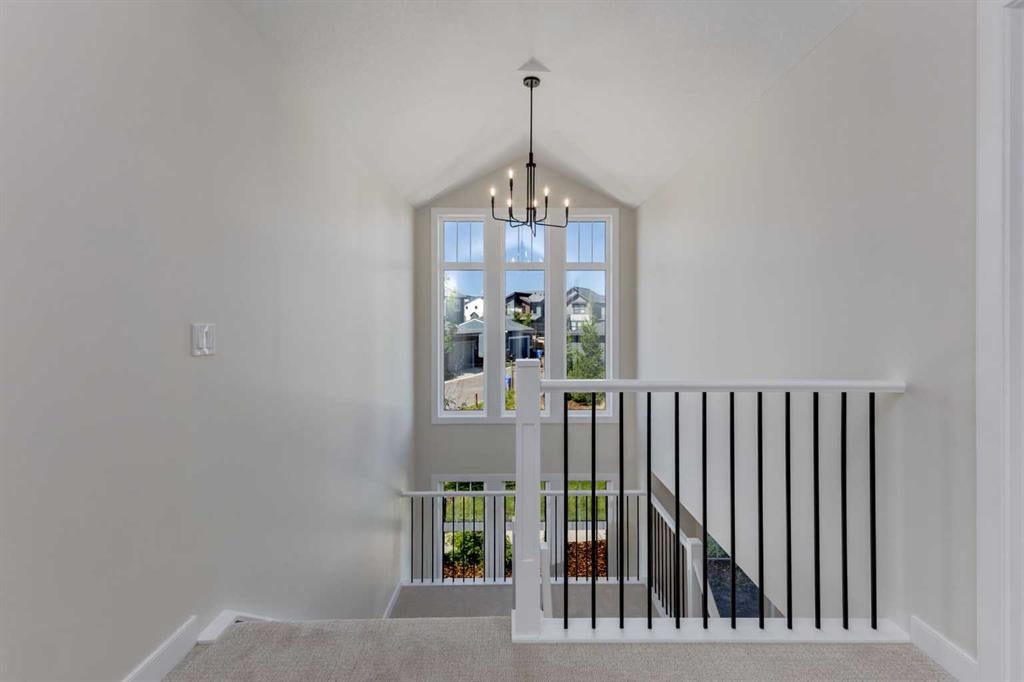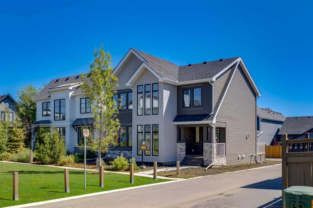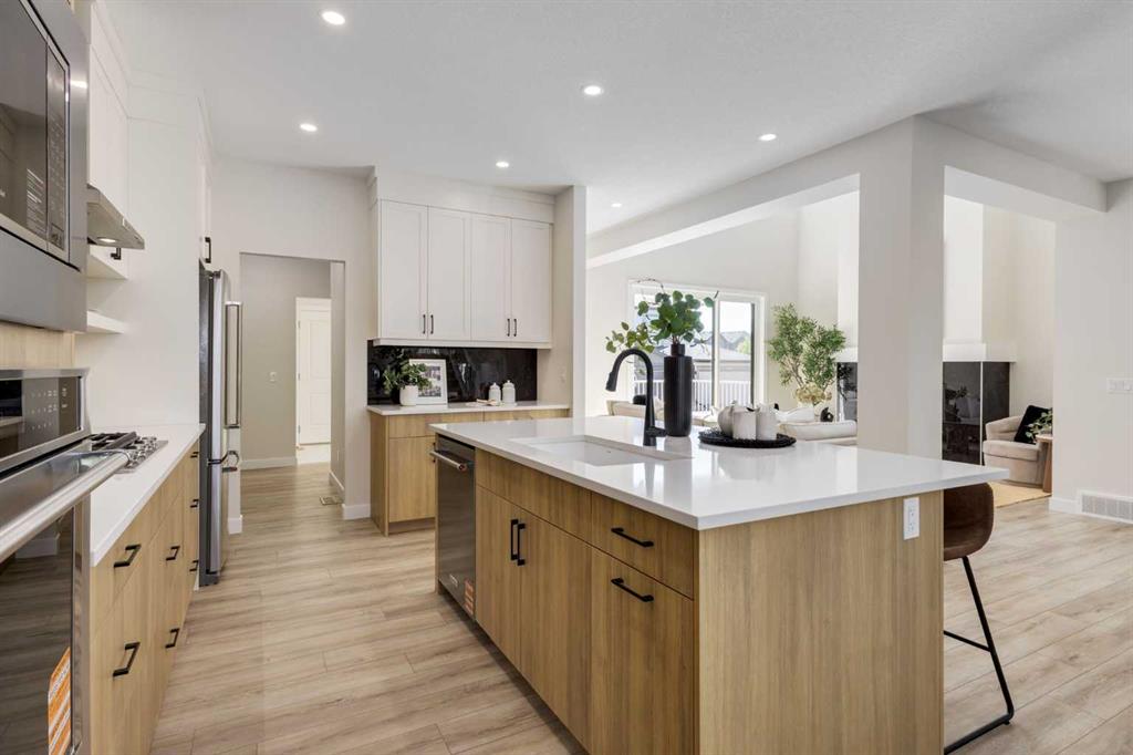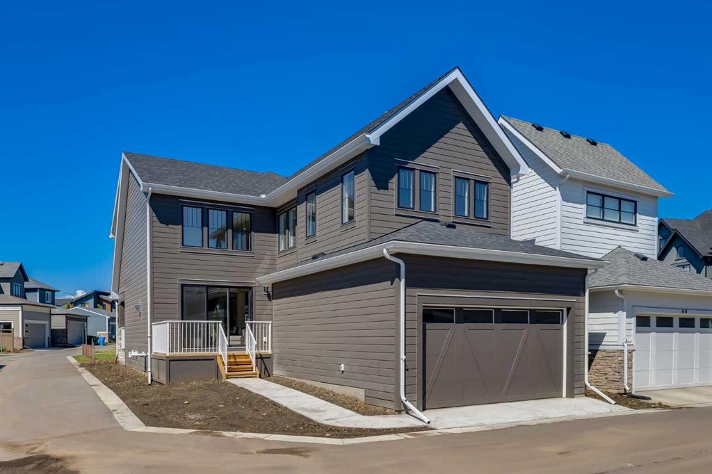 Welcome to the Engler, an architectural two-storey that pairs standout design with day-to-day function, set in a prime front-facing position on Hearth Green. With the park right out front, you’ll love having a natural gathering place for kids to run, neighbours to connect, or a quiet evening by the community firepit. Inside, the home makes an immediate impression with an open-concept plan filled with natural light, soaring two-storey windows, and a dramatic floating staircase with open black railing that keeps sightlines wide and the vibe airy. The kitchen is the true centrepiece, equal parts beautiful and practical, finished with two-tone cabinetry (white uppers raised to the ceiling and rich wood-grain lowers), crisp white quartz countertops, a white Silgranite sink, sleek black hardware, and a bold black backsplash that brings the whole look together. Cooking is a treat with a gas range plus built-in oven and microwave, while the open shelving beside the hood fan adds the perfect modern touch for styling and everyday convenience. Entertaining is effortless thanks to the full butler’s bar, complete with a sink and space for an additional fridge or freezer, ideal for hosting, family movie nights, or keeping things organized when life gets busy. The dining area is bright and welcoming with a statement light fixture and sun pouring in throughout the day, flowing seamlessly into the open-to-above living room where a modern black tile fireplace surround mirrors the kitchen finishes for a cohesive, designer feel. At the back of the home, thoughtful locker-style built-ins and generous mudroom storage keep backpacks, boots, and winter gear neatly tucked away, because real life happens here, and this home is built for it. Upstairs, the winged bedroom layout creates privacy and smart separation: the vaulted owner’s suite overlooks the backyard, while the secondary bedrooms are positioned at the front of the home. You’ll appreciate the balance of comfort and function with a spa-inspired ensuite, a spacious five-piece main bath for the kids, and a large upper laundry room that makes the daily routine smoother. The open-to-below upper hallway adds a loft-like feel and reinforces the bright, expansive atmosphere created by the home’s abundant windows. Downstairs, 9’ foundation walls offer excellent future development potential and a more open, comfortable basement feel. Outside, step onto your deck right off the patio doors, perfect for summer BBQs and morning coffee, plus enjoy the convenience of an attached double garage. Set in Alpine Park, this home is surrounded by a community built around connection: parks, pathways, and a future village centre with local shops and cafés on the way. With design inspired by Calgary’s mountain, prairie, and urban influences, Alpine Park is crafted to encourage neighbourliness, and the Engler is a perfect match for that lifestyle.