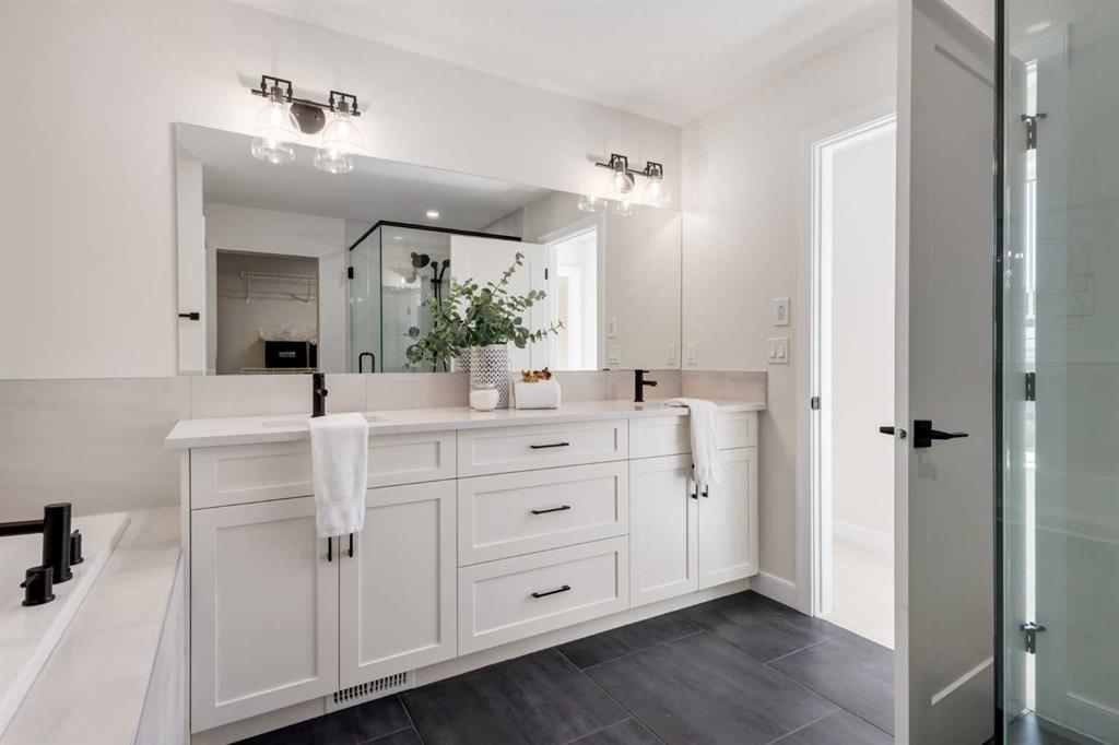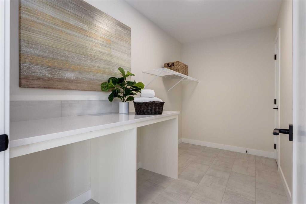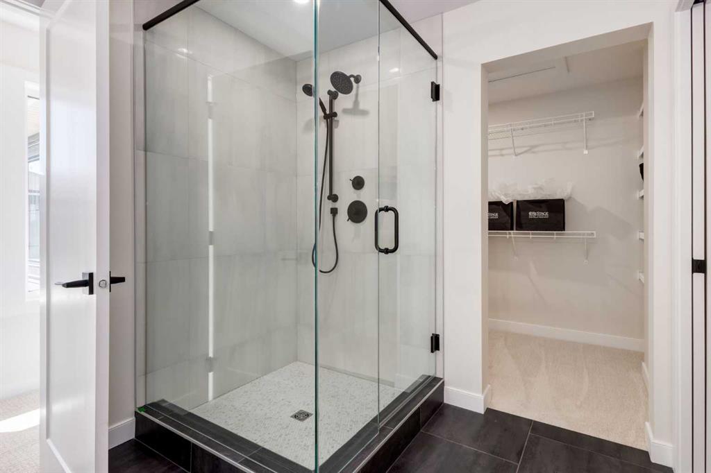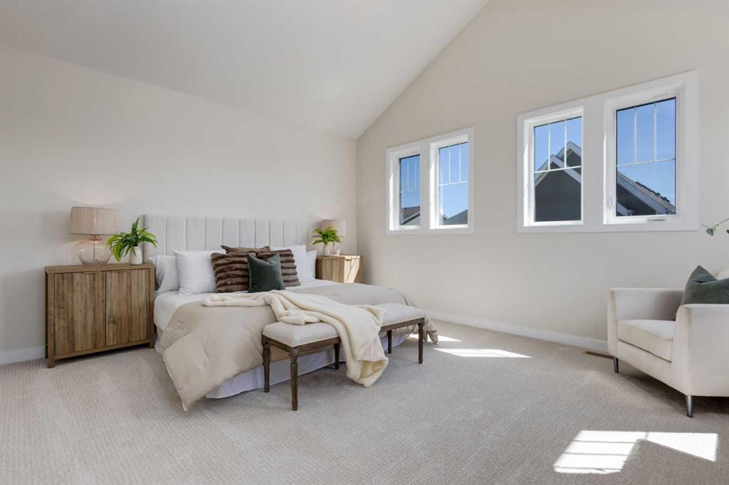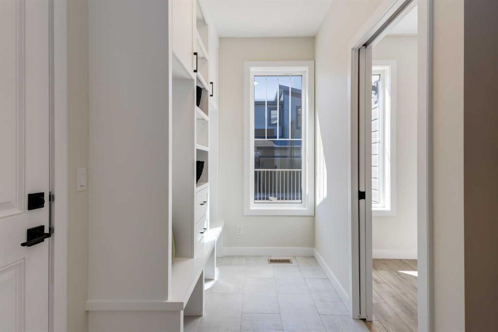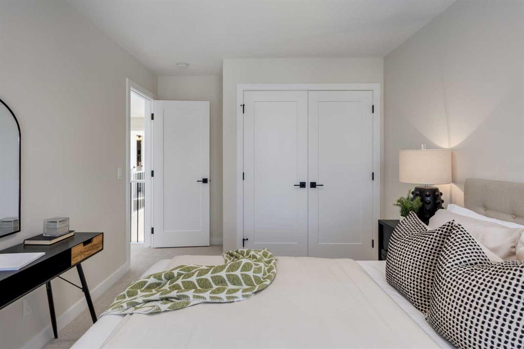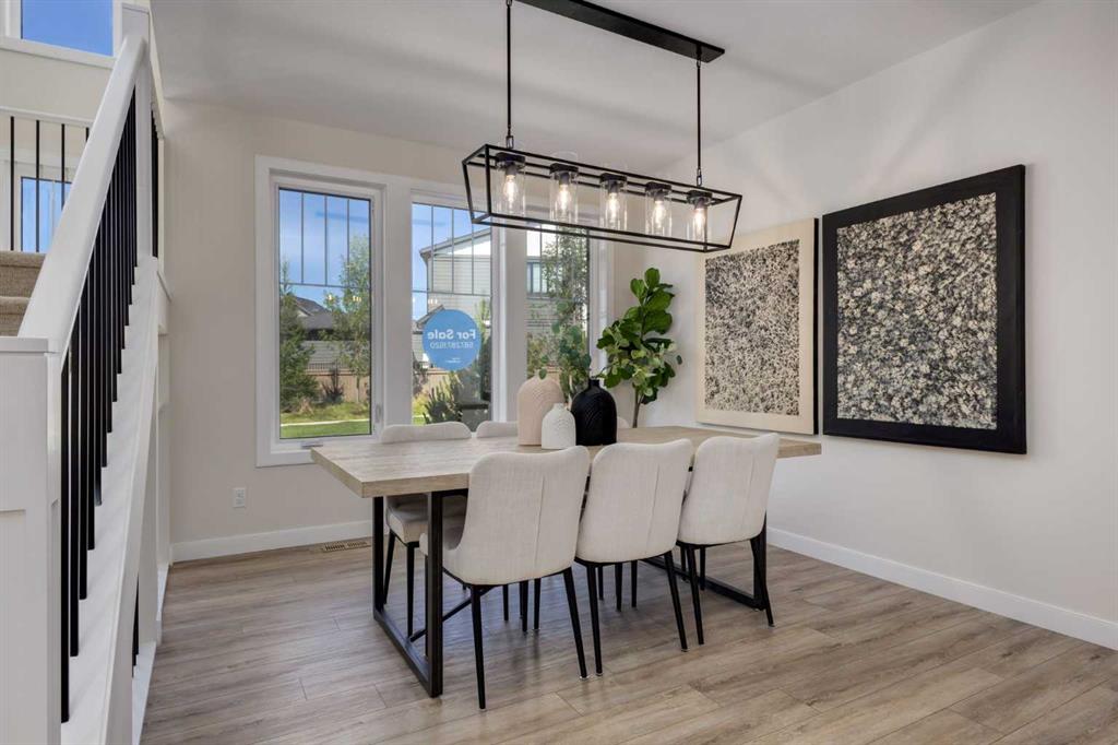 Welcome to the Engler, an architectural two-storey that pairs standout design with day-to-day function, set in a prime front-facing position on Hearth Green. With the park right out front, you’ll love having a natural gathering place for kids to run, neighbours to connect, or a quiet evening by the community firepit. Inside, the home makes an immediate impression with an open-concept plan filled with natural light, soaring two-storey windows, and a dramatic floating staircase with open black railing that keeps sightlines wide and the vibe airy. The kitchen is the true centrepiece, equal parts beautiful and practical, finished with two-tone cabinetry (white uppers raised to the ceiling and rich wood-grain lowers), crisp white quartz countertops, a white Silgranite sink, sleek black hardware, and a bold black backsplash that brings the whole look together. Cooking is a treat with a gas range plus built-in oven and microwave, while the open shelving beside the hood fan adds the perfect modern touch for styling and everyday convenience. Entertaining is effortless thanks to the full butler’s bar, complete with a sink and space for an additional fridge or freezer, ideal for hosting, family movie nights, or keeping things organized when life gets busy. The dining area is bright and welcoming with a statement light fixture and sun pouring in throughout the day, flowing seamlessly into the open-to-above living room where a modern black tile fireplace surround mirrors the kitchen finishes for a cohesive, designer feel. At the back of the home, thoughtful locker-style built-ins and generous mudroom storage keep backpacks, boots, and winter gear neatly tucked away, because real life happens here, and this home is built for it. Upstairs, the winged bedroom layout creates privacy and smart separation: the vaulted owner’s suite overlooks the backyard, while the secondary bedrooms are positioned at the front of the home. You’ll appreciate the balance of comfort and function with a spa-inspired ensuite, a spacious five-piece main bath for the kids, and a large upper laundry room that makes the daily routine smoother. The open-to-below upper hallway adds a loft-like feel and reinforces the bright, expansive atmosphere created by the home’s abundant windows. Downstairs, 9’ foundation walls offer excellent future development potential and a more open, comfortable basement feel. Outside, step onto your deck right off the patio doors, perfect for summer BBQs and morning coffee, plus enjoy the convenience of an attached double garage. Set in Alpine Park, this home is surrounded by a community built around connection: parks, pathways, and a future village centre with local shops and cafés on the way. With design inspired by Calgary’s mountain, prairie, and urban influences, Alpine Park is crafted to encourage neighbourliness, and the Engler is a perfect match for that lifestyle.