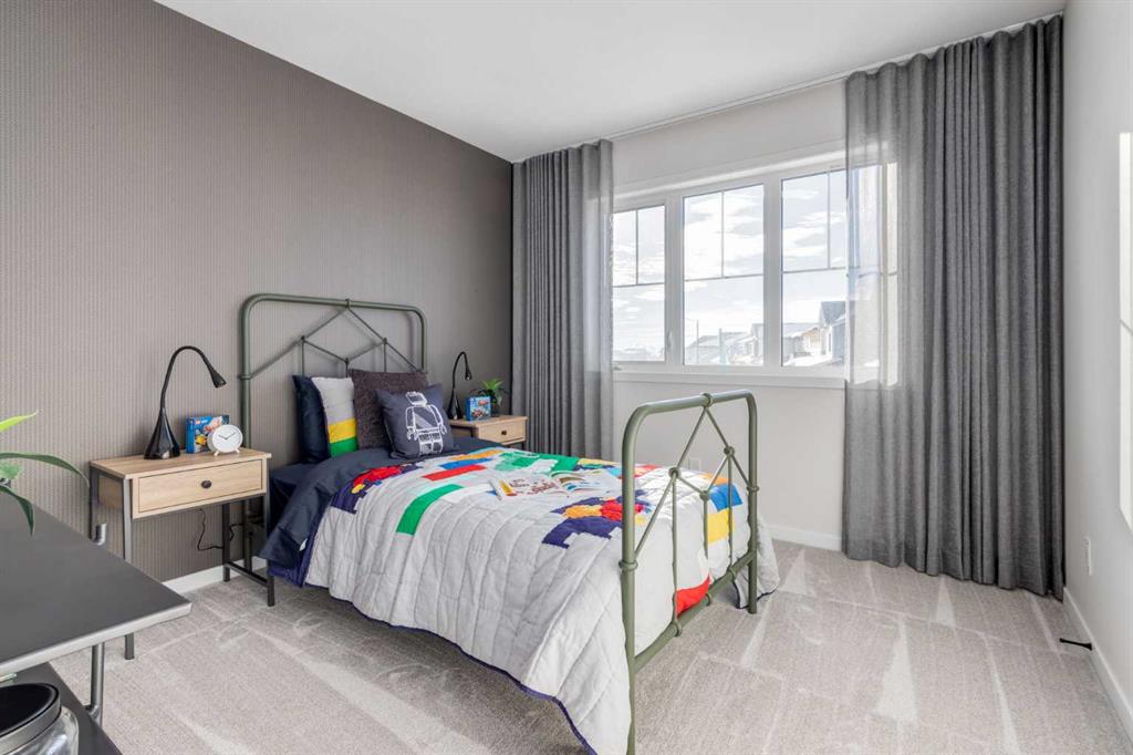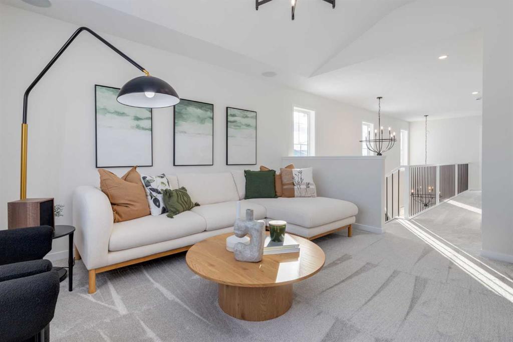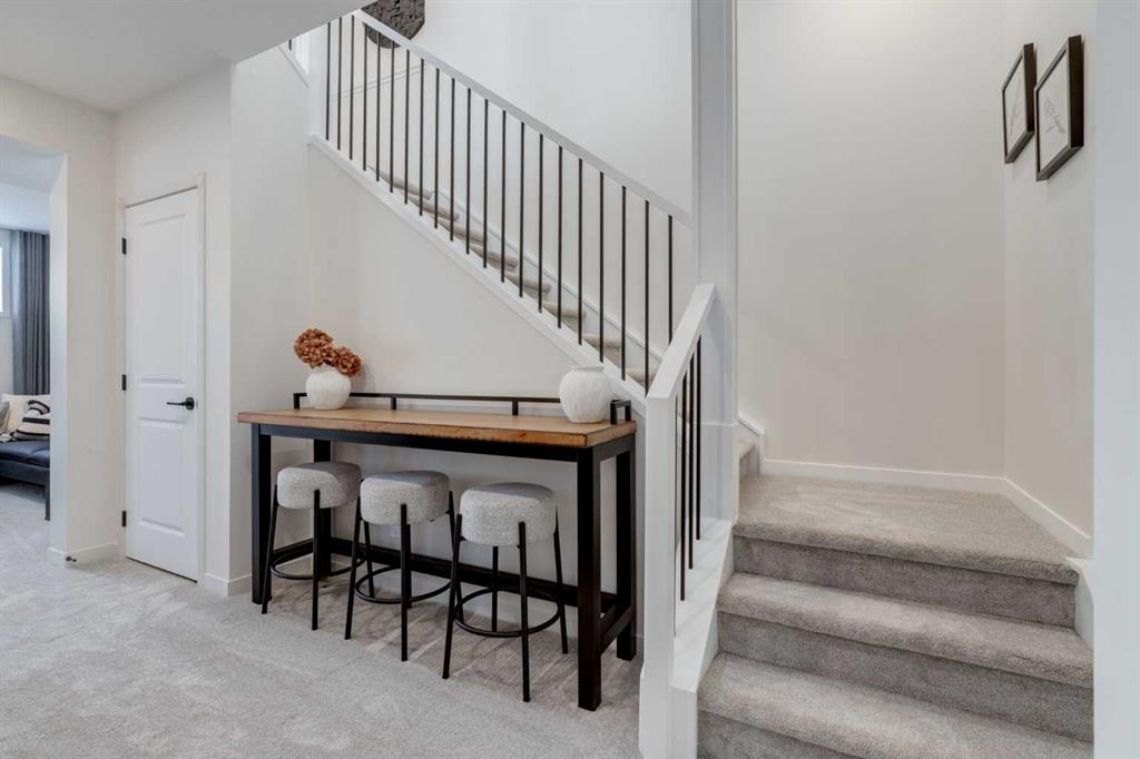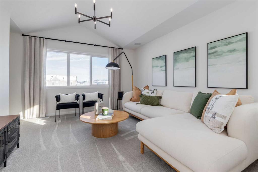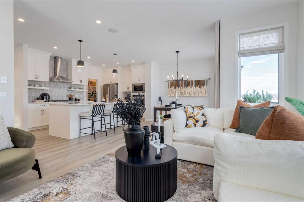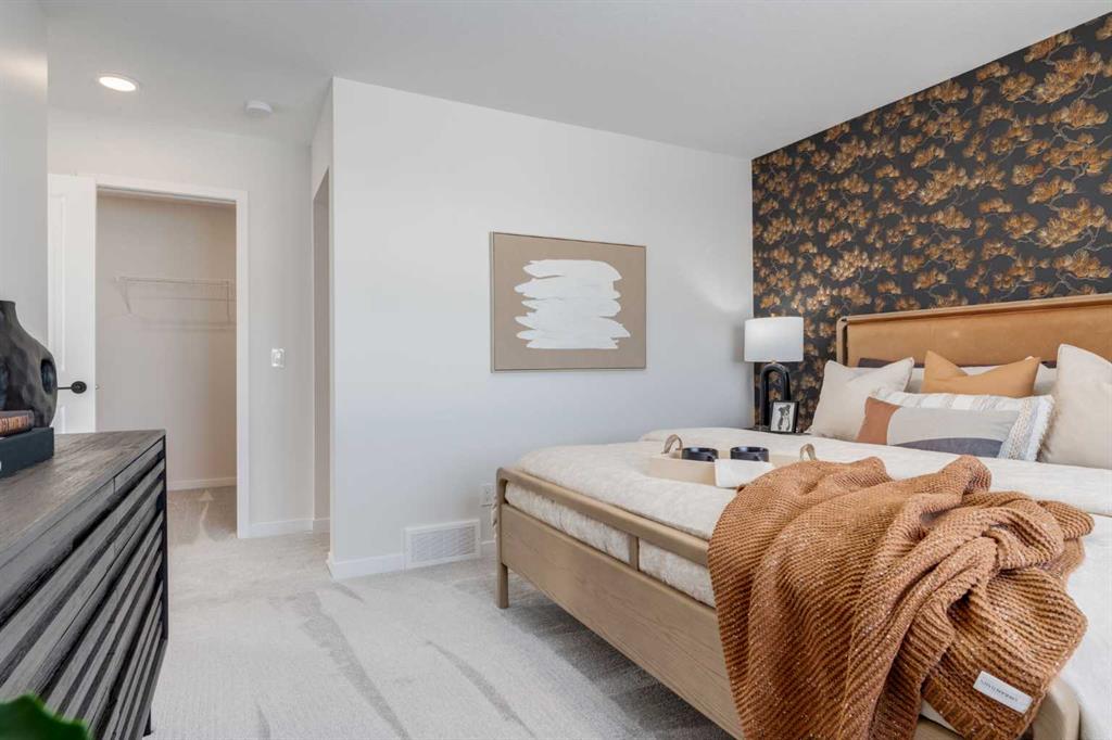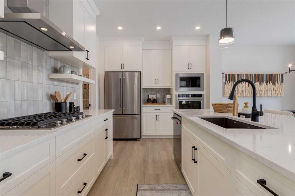 Meet The Strickland—a thoughtfully designed 2,093 sq. ft. home that blends everyday function with elevated finishes. With 3 bedrooms, 2.5 baths, a double attached garage, and a rear wood deck, this plan is built for modern family living and easy entertaining. A grand entryway makes a great first impression, paired with an oversized front closet that keeps coats, boots, and gear out of sight. At the back of the home, the mudroom with built-in locker creates the perfect drop zone for backpacks and busy routines. The main floor is designed around connection, with a centralized kitchen that links the living and dining areas so you can cook, visit, and relax in one open, welcoming space. The gourmet kitchen upgrade is the showpiece: full-height cabinetry, quartz countertops, two sets of pot & pan drawers, and a statement chimney hood fan framed by open shelving and finished with a tile backsplash to the ceiling. The premium KitchenAid appliance package includes a built-in wall oven & microwave, 5-burner gas cooktop, French door/bottom freezer fridge, and dishwasher. An oversized island is highlighted by upgraded matte black pendant lighting, and a smart walk-through pantry keeps clutter tucked away and grocery days simple. Luxury vinyl plank flooring spans the main level, with upgraded windows and an electric fireplace adding warmth. Upstairs, the thoughtful plan continues. A vaulted bonus room becomes your private family hub—movie nights, a kids’ lounge, or a quiet retreat away from the main level. Second-floor laundry is centrally located to simplify day-to-day life. The front kids’ wing features two spacious secondary bedrooms with easy access to the family bath, while the primary suite is a true escape with a large walk-in closet and a spa-inspired 5-piece ensuite with generous vanity space and storage. Outside, enjoy summer evenings and weekend BBQs on your rear wood deck and appreciate the durability and curb appeal of a Hardie board exterior. Modern details continue with metal railings on the stairs and upper floor. Future-focused features include solar-ready infrastructure with 200-amp service, a 64-panel breaker, and conduit to the roof. Montrose is a master-planned community on High River’s south side with parks, pathways, and a signature pond—great for walks, biking, and year-round time outdoors. Enjoy quick access to schools, recreation, and everyday amenities. A home that’s stylish, bright, and built around real life—The Strickland is one you’ll want to experience in person. **Photos are from the show home/previous builds to demonstrate quality of construction & finishes and may not be an exact representation of this home**